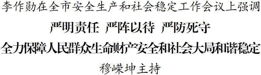 4月2日,全市安全生产和社会稳定工作会议召开。市委书记李作勋出席并讲话。他强调,要深入学习贯彻习近平总书记关于统筹发展和安全的重要论述,细化落实党中央、国务院和省委、省政府最新部署要求,严明责任、严阵以待、严防死守,更加有力有效防范化解各类风险隐患,全力保障人民群众生命财产安全和社会大局和谐稳定。市委副书记、市长穆嵘坤主持会议,有关市领导参加。